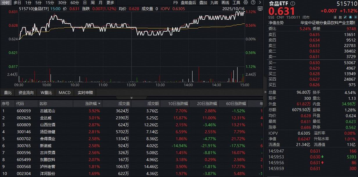 吃喝板块今日(10月16日)继续猛攻!反映吃喝板块整体走势的食品ETF(515710)开盘后持续红盘震荡,尾盘再度猛拉,截至收盘,场内价格涨1.12%。
