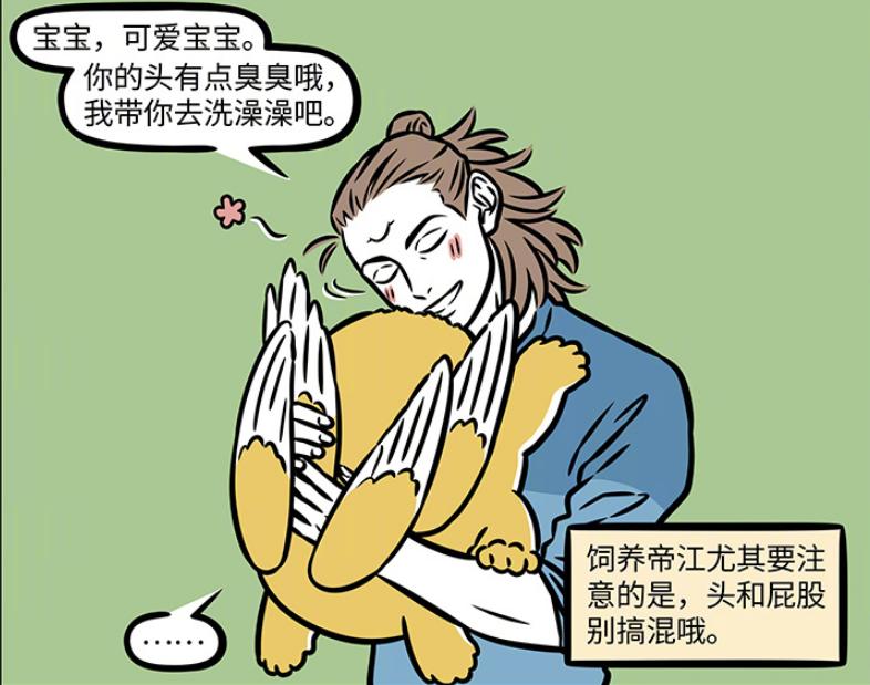 而这个时候往往会遇到一个问题,就是把帝江的头和屁股弄混,即使是自身毛茸茸爱好者的杨戬也会出现这种情况,直接把帝江的屁股当成了头,用十分温柔的语气表示帝江的头闻起来有点臭臭的,需要去洗个澡